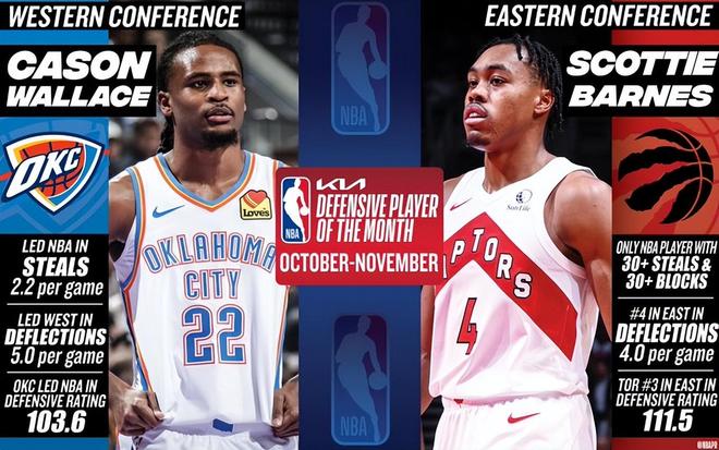 猛龙队前锋斯科蒂-巴恩斯当选东部联盟10-11月最佳防守球员,雷霆队后卫凯森-华莱士则斩获西部联盟该奖项。